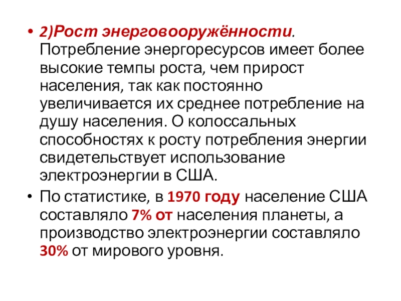 Слайд 272)Рост энерговооружённости. Потребление энергоресурсов имеет более высокие темпы роста, чем прирост