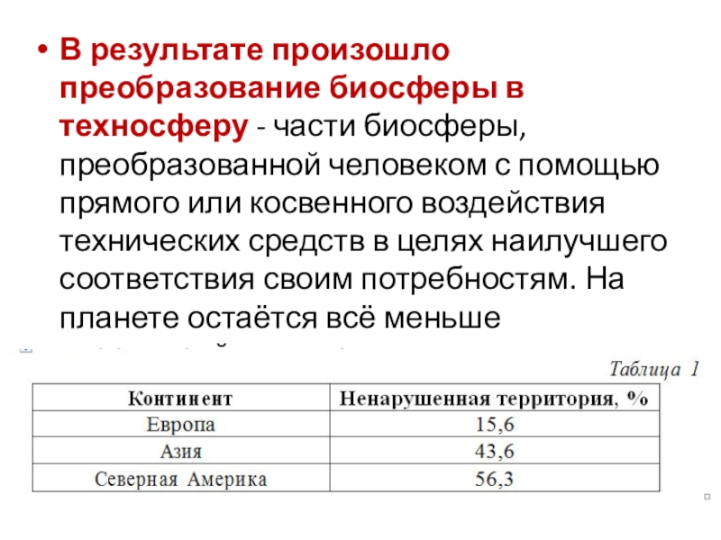 человеком с помощью прямого или косвенного воздействия технических средств в целях наилучшего соответствия своим потребностям. На планете остаётся всё меньше территорий с ненарушенными экосистемами (табл. 1).
