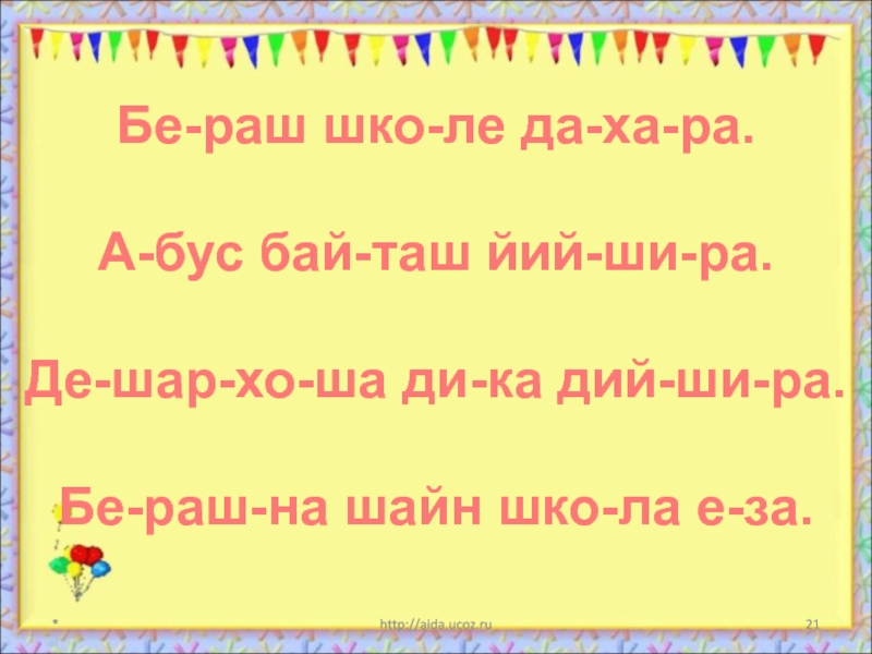 *http://aida.ucoz.ruБе-раш шко-ле да-ха-ра.А-бус бай-таш йий-ши-ра.Де-шар-хо-ша ди-ка дий-ши-ра.Бе-раш-на шайн шко-ла е-за.