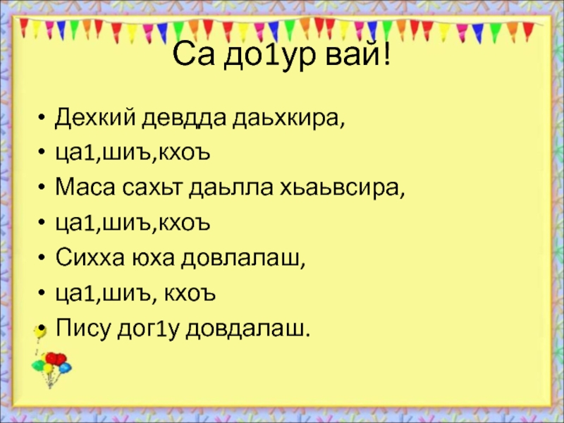 Са до1ур вай!Дехкий девдда даьхкира, ца1,шиъ,кхоъМаса сахьт даьлла хьаьвсира,ца1,шиъ,кхоъСихха юха довлалаш,ца1,шиъ, кхоъПису дог1у довдалаш.