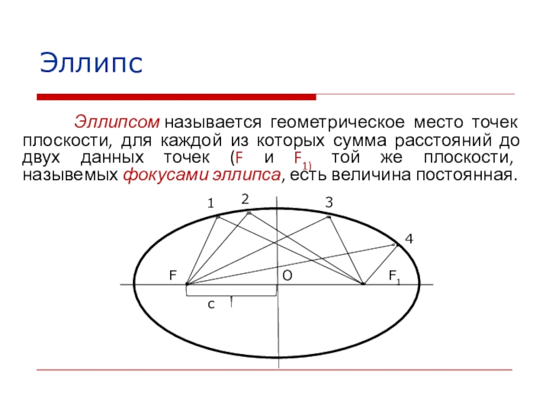 которых сумма расстояний до двух данных точек (F и F1) той же плоскости, назывемых фокусами эллипса, есть величина постоянная.