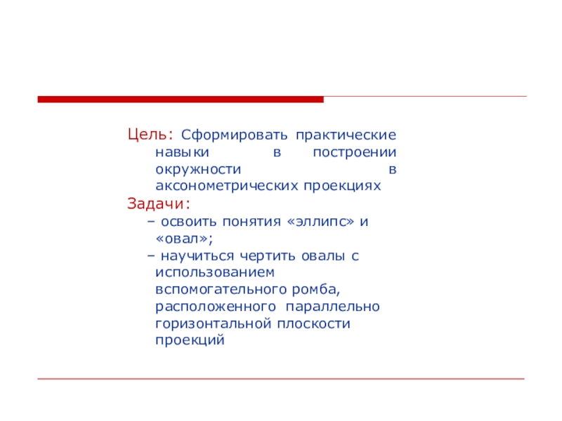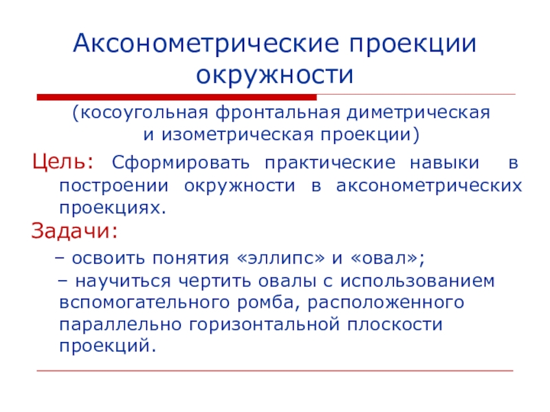 Цель: Сформировать практические навыки в построении окружности в аксонометрических проекцияхЗадачи:  – освоить понятия «эллипс» и «овал»;