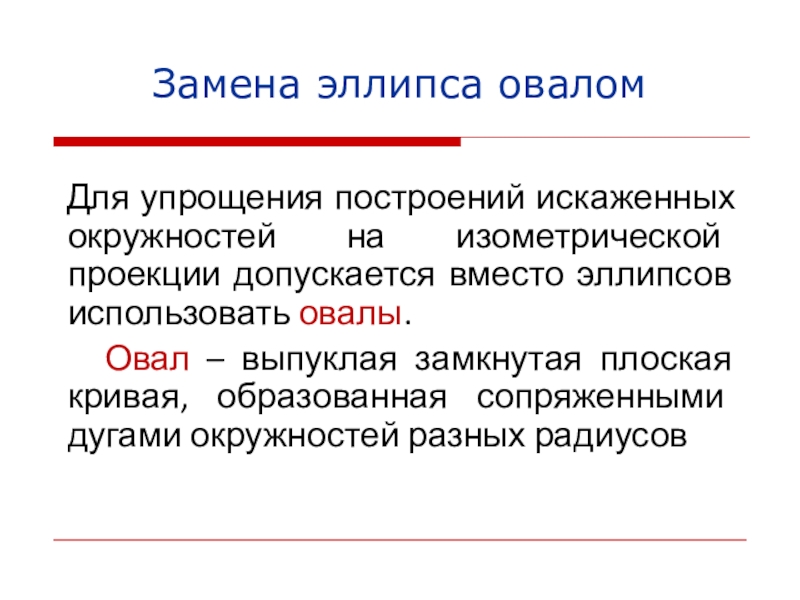 Замена эллипса овалом	Для упрощения построений искаженных окружностей на изометрической проекции допускается вместо эллипсов использовать овалы.