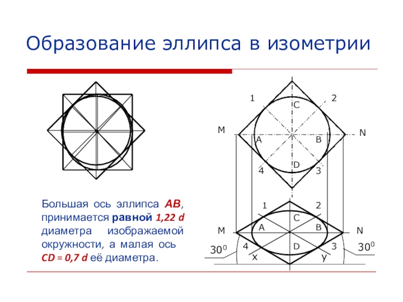 300300MABCD1N234yxОбразование эллипса в изометрииБольшая ось эллипса АВ, принимается равной 1,22 d диаметра изображаемой окружности, а малая ось