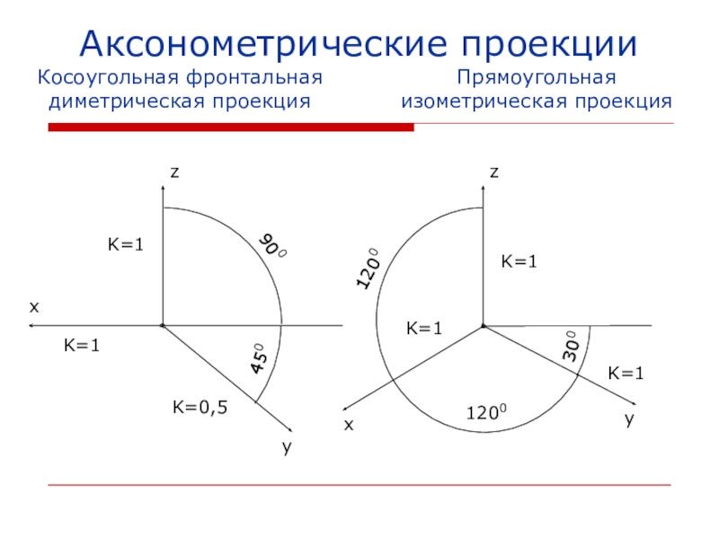 450Аксонометрические проекцииzxy900K=1K=1K=0,512001200300K=1zxyK=1K=1Косоугольная фронтальная диметрическая проекцияПрямоугольная изометрическая проекция