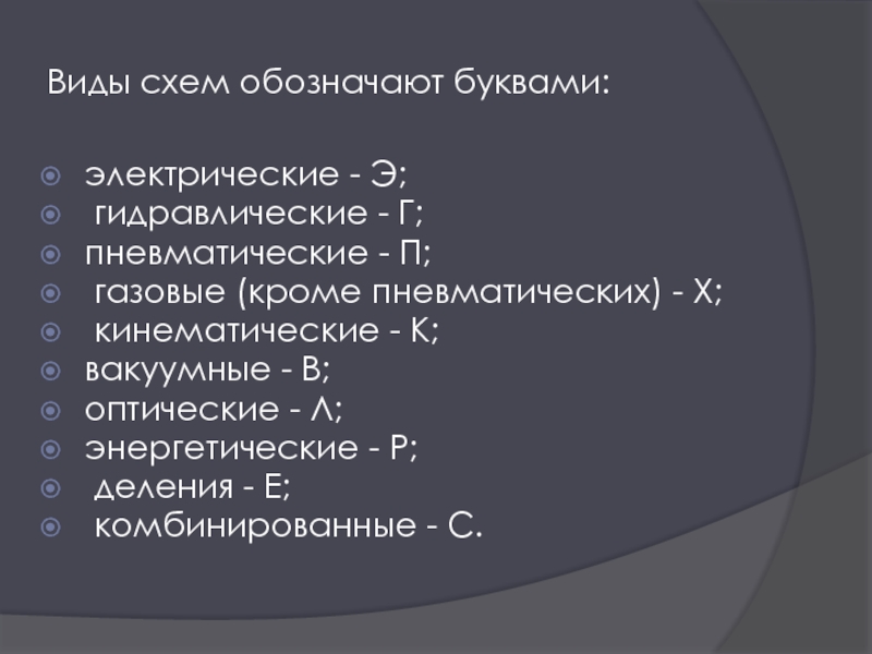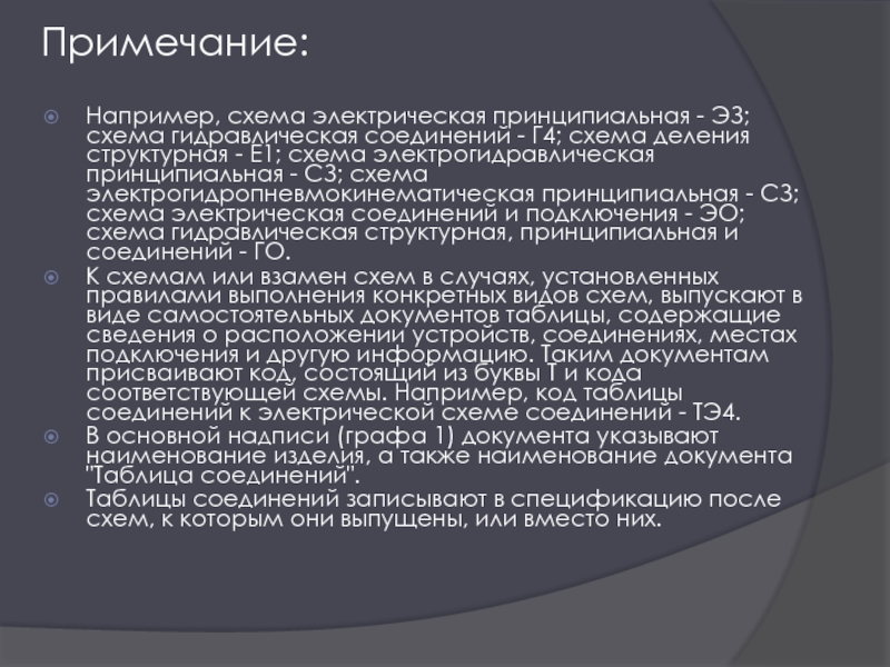 Например, схема электрическая принципиальная - ЭЗ; схема гидравлическая соединений - Г4;
