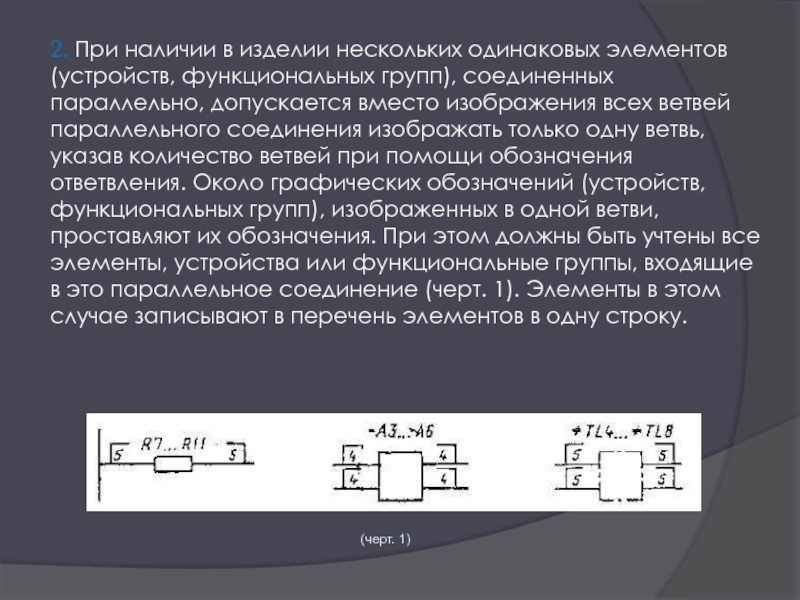 соединенных параллельно, допускается вместо изображения всех ветвей параллельного соединения изображать только одну ветвь, указав количество ветвей при помощи обозначения ответвления. Около графических обозначений (устройств, функциональных групп), изображенных в одной ветви, проставляют их обозначения. При этом должны быть учтены все элементы, устройства или функциональные группы, входящие в это параллельное соединение (черт. 1). Элементы в этом случае записывают в перечень элементов в одну строку.