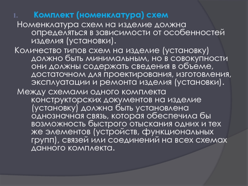 Количество типов схем на изделие (установку) должно быть минимальным, но в совокупности они должны содержать сведения в объеме, достаточном для проектирования, изготовления, эксплуатации и ремонта изделия (установки).