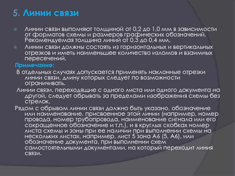 В отдельных случаях допускается применять наклонные отрезки линии связи, длину которых следует по возможности ограничивать.