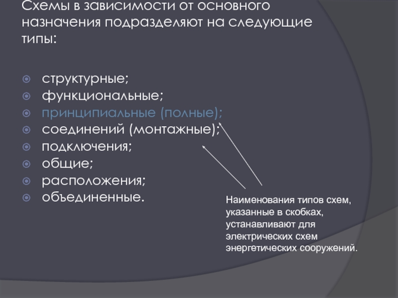 Наименования типов схем, указанные в скобках, устанавливают для электрических схем энергетических сооружений.