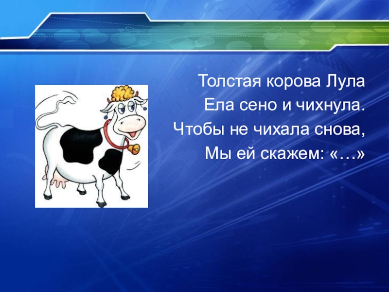 Толстая корова ЛулаЕла сено и чихнула.Чтобы не чихала снова,Мы ей скажем: «…»