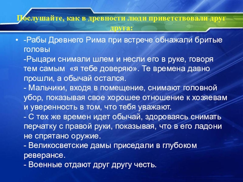 Послушайте, как в древности люди приветствовали друг друга:-Рабы Древнего Рима при встрече обнажали бритые головы -Рыцари снимали шлем и несли его в руке, говоря тем самым «я тебе доверяю». Те времена давно прошли, а обычай
