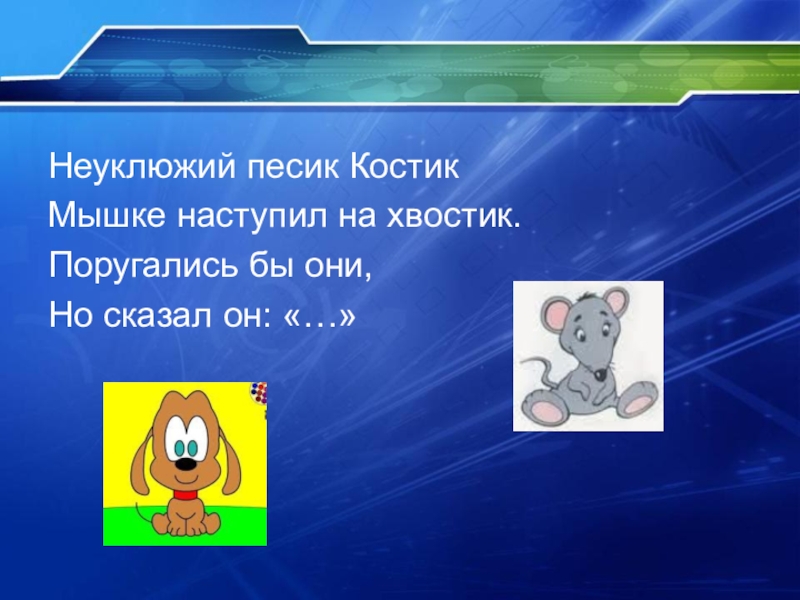 Неуклюжий песик КостикМышке наступил на хвостик.Поругались бы они,Но сказал он: «…»