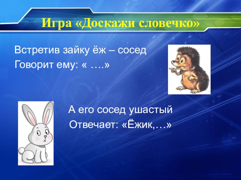 Игра «Доскажи словечко»Встретив зайку ёж – соседГоворит ему: « ….»А его сосед ушастыйОтвечает: «Ёжик,…»