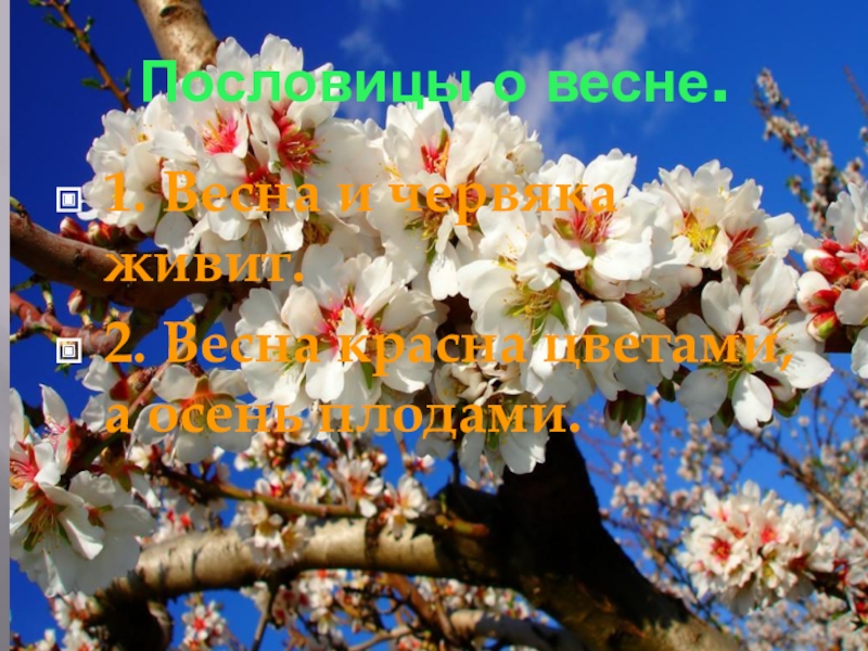 Пословицы о весне.1. Весна и червяка живит.2. Весна красна цветами, а осень плодами.