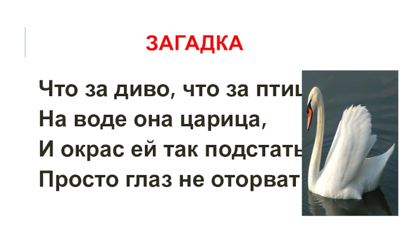 загадкаЧто за диво, что за птица,На воде она царица,И окрас ей так подстать,Просто глаз не оторвать.