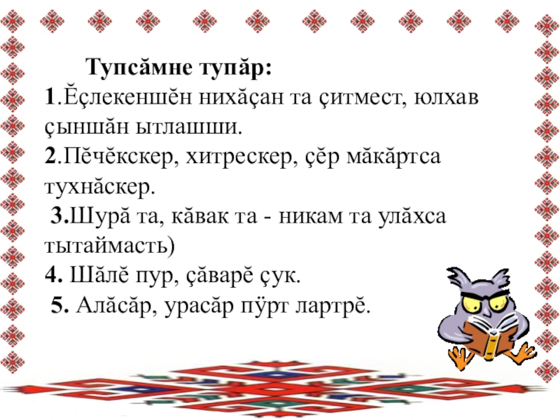Тупсăмне тупăр:1.Ĕçлекеншĕн нихăçан та çитмест, юлхав çыншăн ытлашши.2.Пĕчĕкскер, хитрескер, çĕр