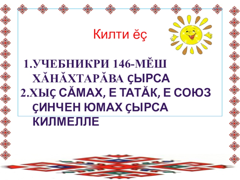 Килти ĕç  1.Учебникри 146-мĕш хăнăхтарăва çырса2.Хыç