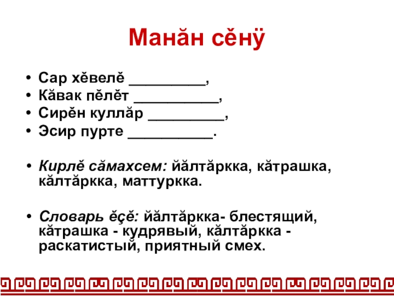 Манăн сěнÿСар хěвелě _________,Кăвак пěлěт __________,Сирěн куллăр _________,Эсир пурте __________.Кирлě сăмахсем: йăлтăркка, кăтрашка, кăлтăркка, маттуркка.Словарь ěçě: йăлтăркка-