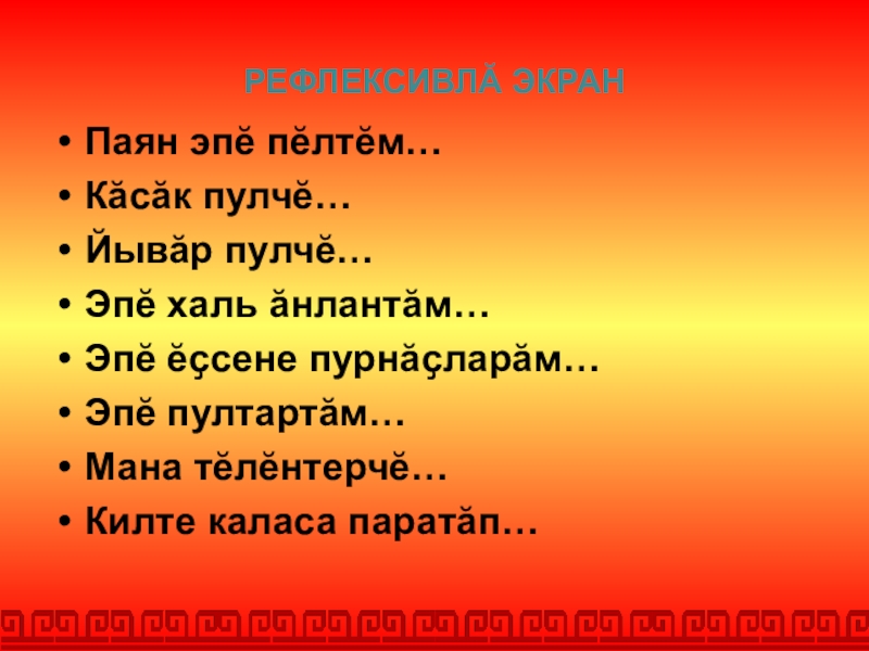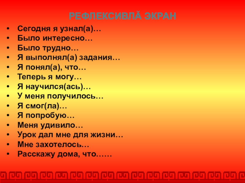 РЕФЛЕКСИВЛӐ ЭКРАНСегодня я узнал(а)…Было интересно…Было трудно…Я выполнял(а) задания…Я понял(а), что…Теперь я могу…Я научился(ась)…У меня получилось…Я смог(ла)…Я попробую…Меня