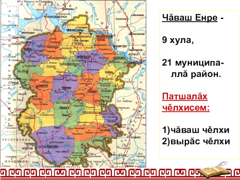 Чăваш Енре - 9 хула, 21 муниципа-ллă район.Патшалăх чěлхисем:1)чăваш чěлхи2)вырăс чěлхи