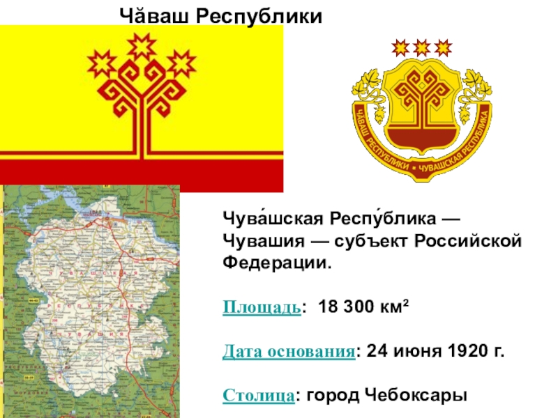 Чăваш Республики Чува́шская Респу́блика — Чувашия — субъект Российской Федерации.Площадь:  18 300 км²Дата основания: 24 июня 1920 г.Столица: город Чебоксары