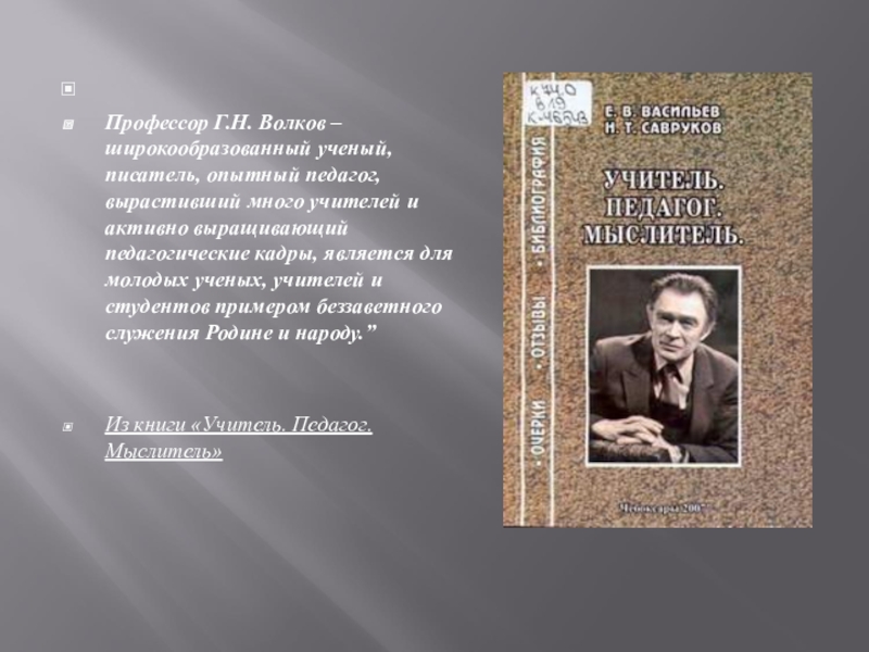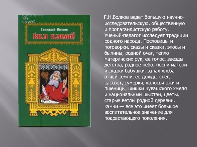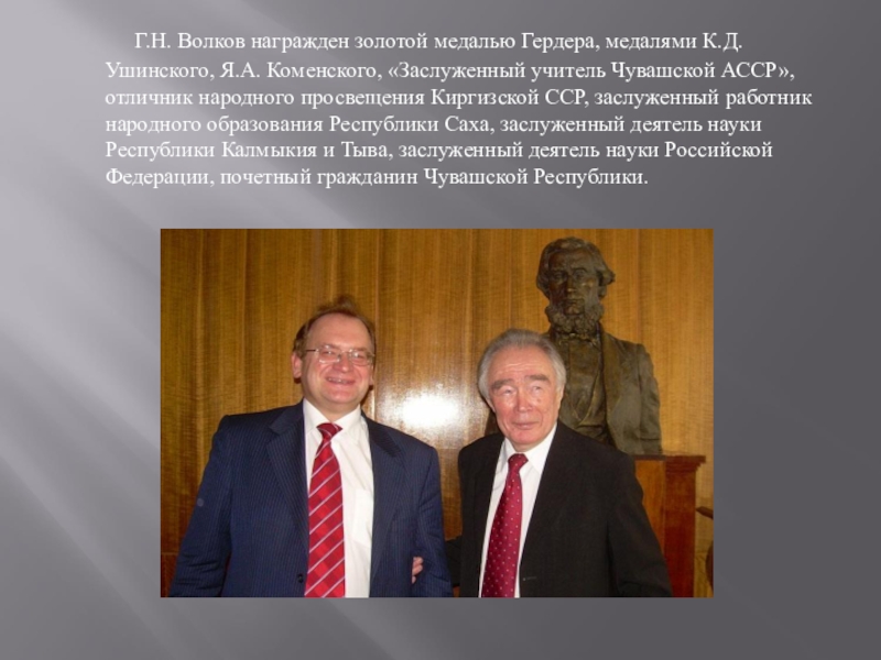 Слайд 11 Имя и дела чувашского ученого-педагога профессора Геннадия Никандровича Волкова