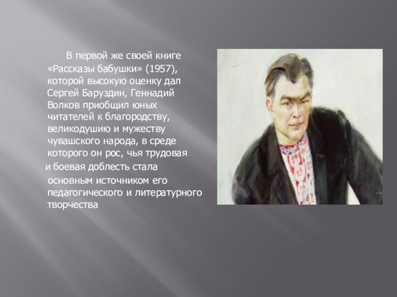 оценку дал Сергей Баруздин, Геннадий Волков приобщил юных читателей к благородству, великодушию и мужеству чувашского народа, в среде которого он рос, чья трудовая