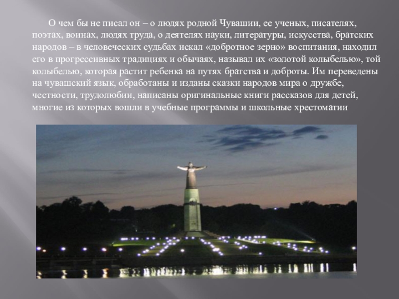 Слайд 13 О чем бы не писал он – о людях родной Чувашии,