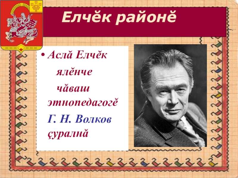 Елчĕк районĕ Аслă Елчĕк    ялĕнче    чăваш этнопедагогĕ  Г. Н. Волков