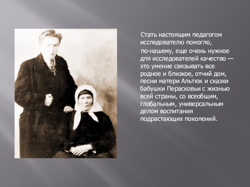 по-нашему, еще очень нужное для исследователей качество — это умение связывать все родное и близкое, отчий дом, песни матери Альтюк и сказки бабушки Перасковьи с жизнью всей страны, со всеобщим, глобальным, универсальным делом воспитания подрастающих поколений.