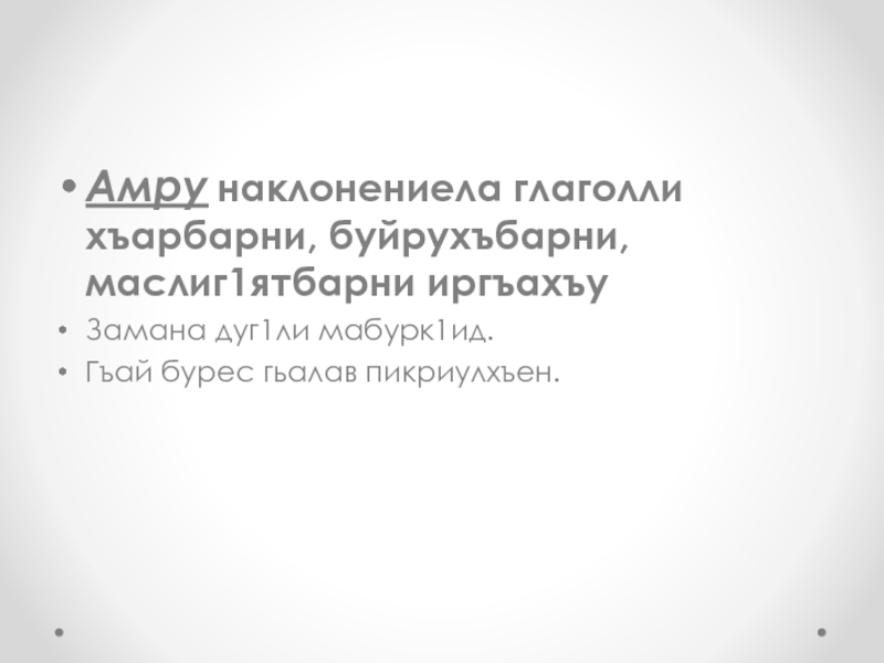 1Амру наклонениела глаголли хъарбарни, буйрухъбарни, маслиг1ятбарни иргъахъуЗамана дуг1ли мабурк1ид.Гъай бурес гьалав пикриулхъен.