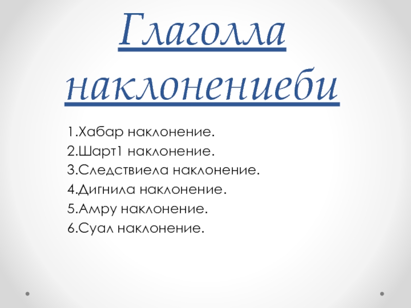 Глаголла наклонениеби1.Хабар наклонение.2.Шарт1 наклонение.3.Следствиела наклонение.4.Дигнила наклонение.5.Амру наклонение.6.Суал наклонение.