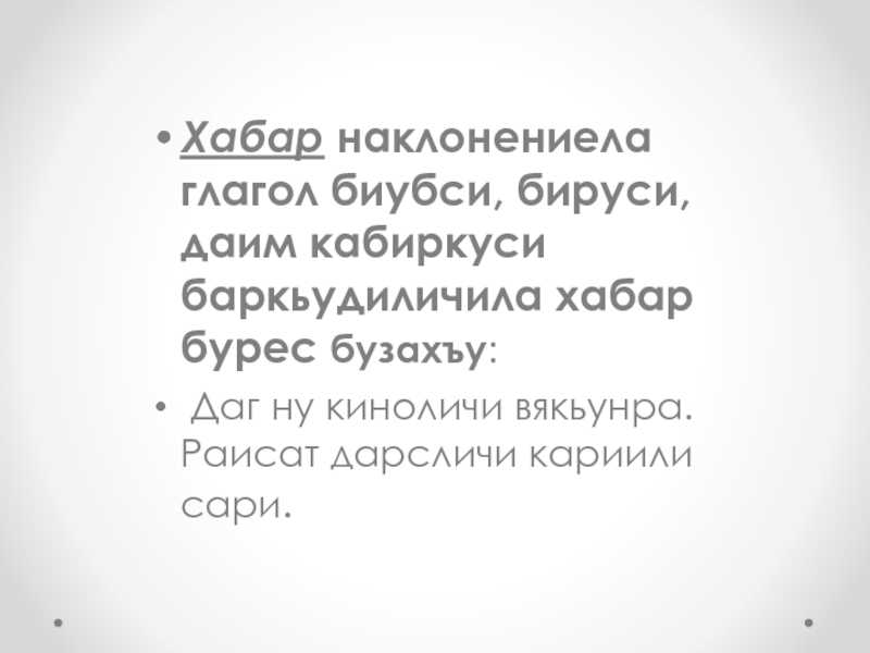 1 Хабар наклонениела глагол биубси, бируси, даим кабиркуси баркьудиличила хабар бурес бузахъу: Даг ну киноличи вякьунра. Раисат дарсличи кариили сари.