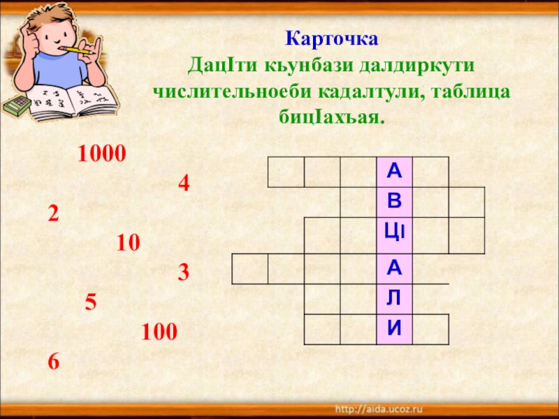 КарточкаДацIти кьунбази далдиркути числительноеби кадалтули, таблица бицIахъая.      1000