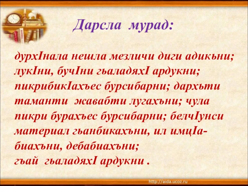Дарсла мурад:   дурхIнала нешла мезличи диги адикьни;   лукIни, бучIни гьаладяхI ардукни;  пикрибикIахъес