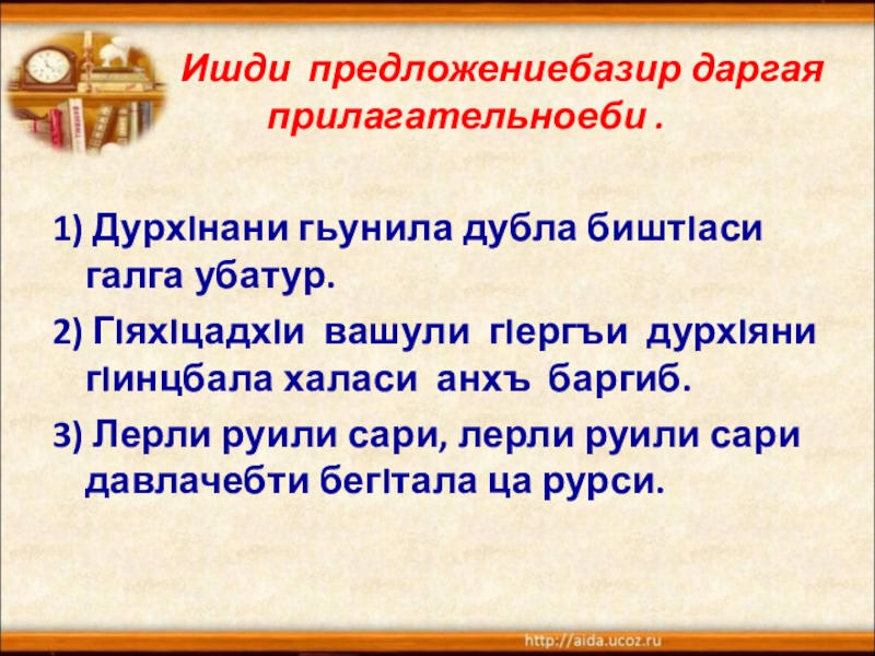 Ишди предложениебазир даргая прилагательноеби .1) ДурхIнани гьунила дубла биштIаси галга убатур.