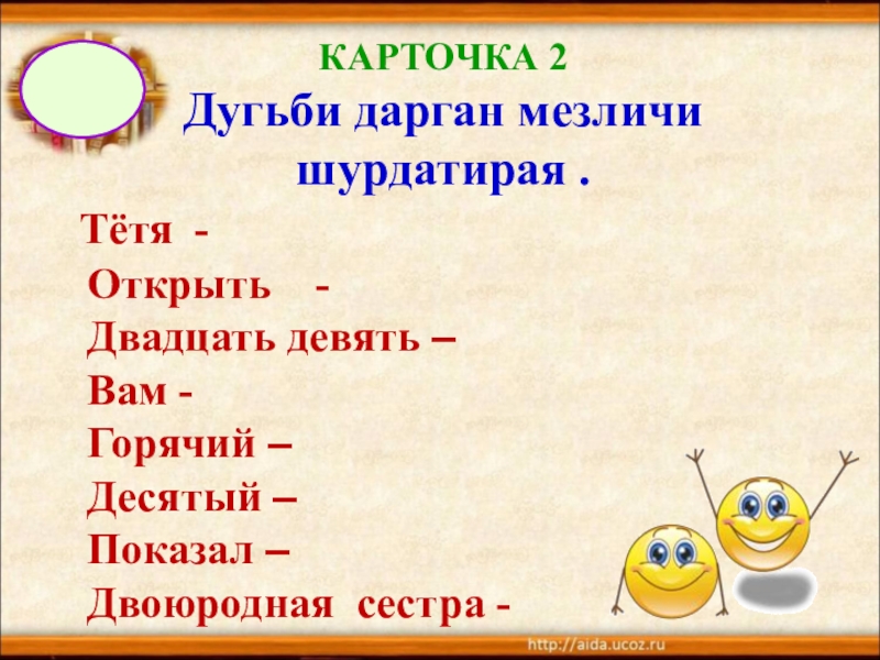 КАРТОЧКА 2Дугьби дарган мезличи шурдатирая .  Тётя -  Открыть  -  Двадцать девять –