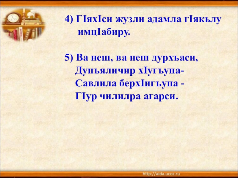 5) Авал дуцIдикIар, кIел чапIдикIар, ца силтIбикIар.