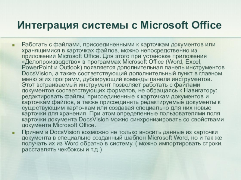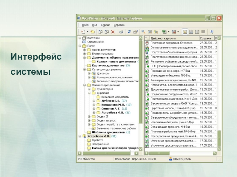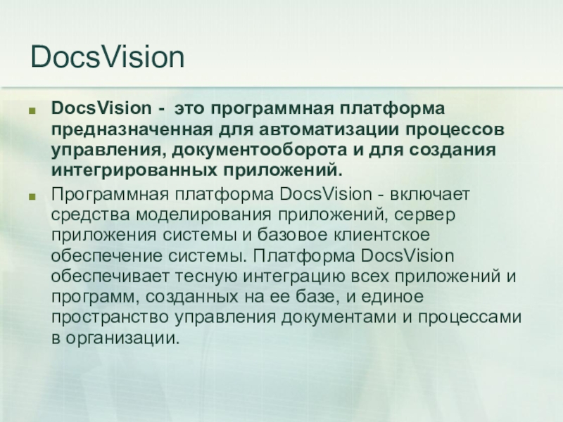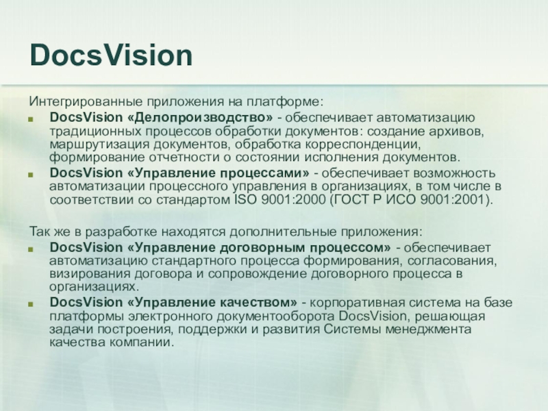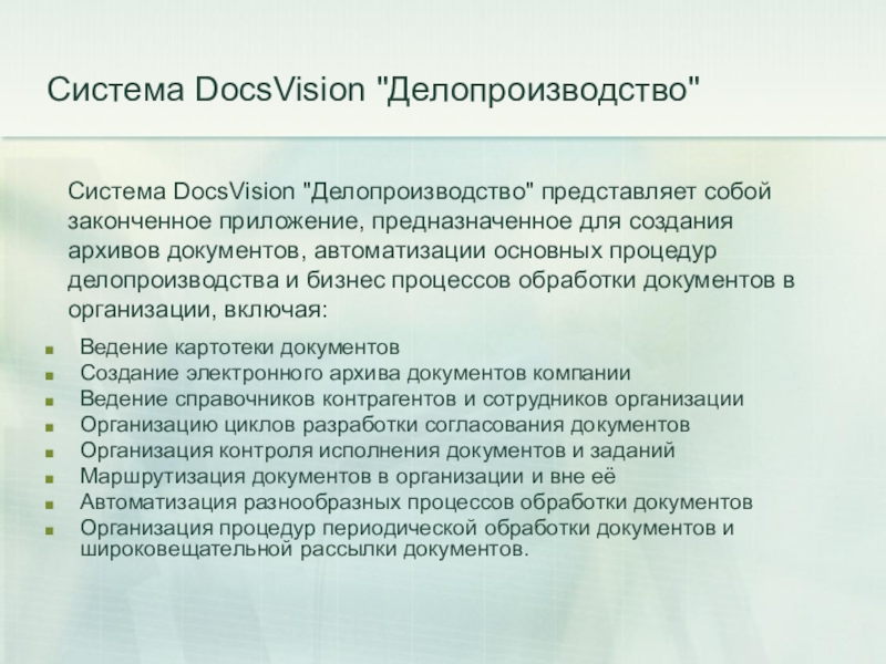 Система DocsVision "Делопроизводство" представляет собой законченное приложение, предназначенное для создания архивов документов, автоматизации основных процедур делопроизводства и бизнес процессов обработки документов в организации, включая: