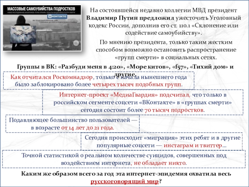 Интернет-проект «МедиаГвардия» подсчитал, что только в российском сегменте соцсети «ВКонтакте» в «группах смерти» сегодня состоит более 70 тысяч подростков.