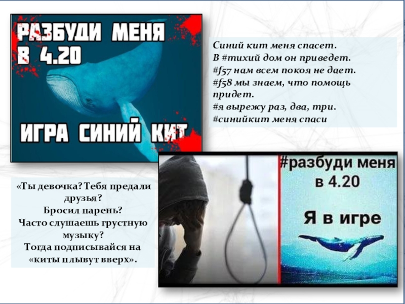 1. Для острых ощущений. Создатели подобных пабликов преследуют цель пощекотать нервы подписчиков. И хотя в таких группах бывают членовредительские задания, однако собственно доведения до самоубийства здесь никто не планирует.