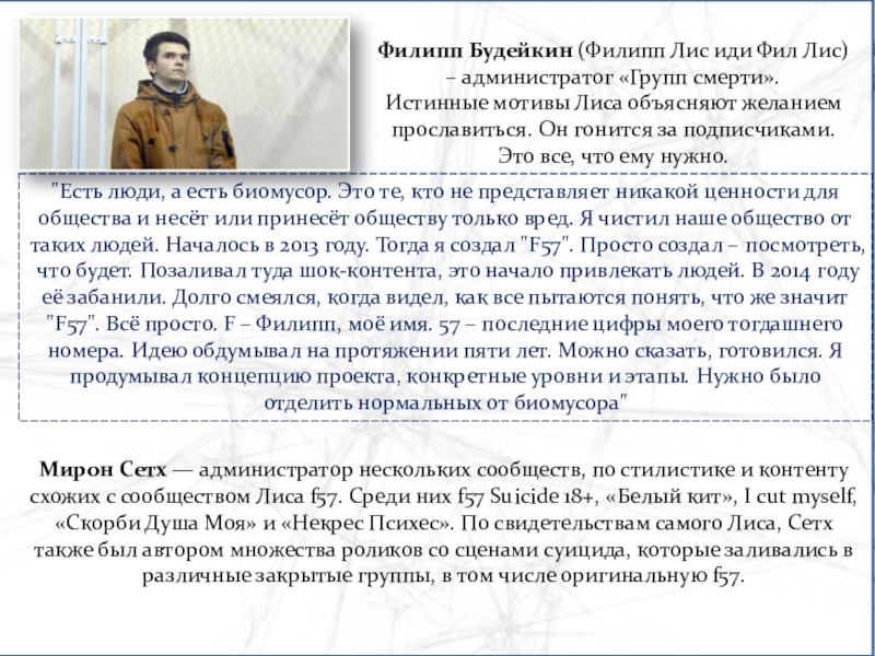 "Есть люди, а есть биомусор. Это те, кто не представляет никакой ценности для общества и несёт или принесёт обществу только вред. Я чистил наше общество от таких людей. Началось в 2013 году. Тогда я создал "F57". Просто создал – посмотреть, что будет. Позаливал туда шок-контента, это начало привлекать людей. В 2014 году её забанили. Долго смеялся, когда видел, как все пытаются понять, что же значит "F57". Всё просто. F – Филипп, моё имя. 57 – последние цифры моего тогдашнего номера. Идею обдумывал на протяжении пяти лет. Можно сказать, готовился. Я продумывал концепцию проекта, конкретные уровни и этапы. Нужно было отделить нормальных от биомусора"