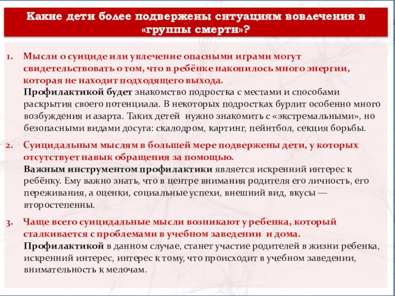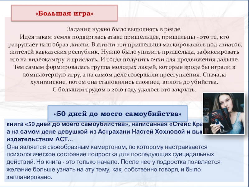 Она является своеобразным камертоном, по которому настраивается психологическое состояние подростка для последующих суицидальных действий. Но книга - это только начало. После нее у подростка появляется желание больше узнать на эту тему, как, собственно говоря, и было запланировано.