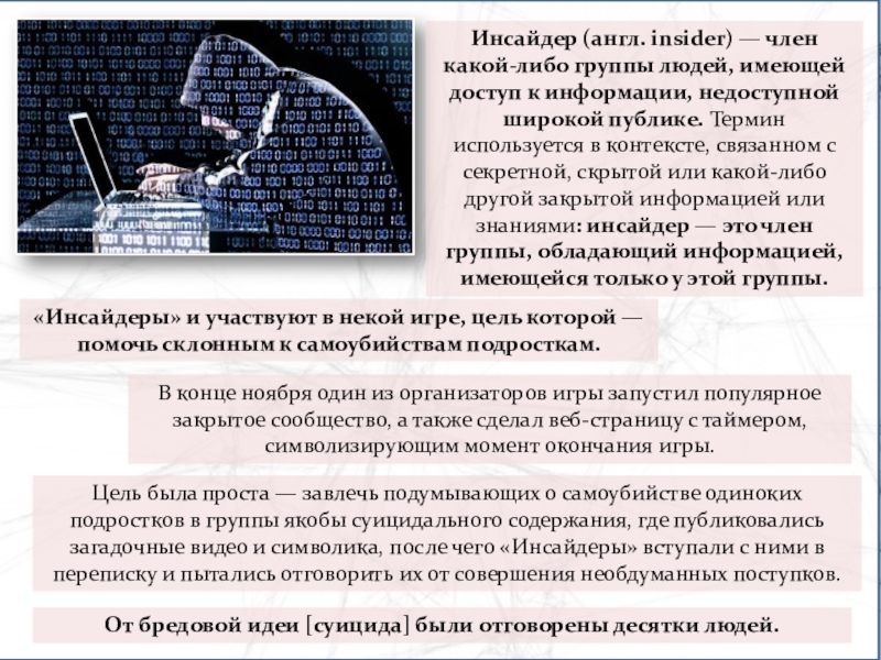 «Инсайдеры» и участвуют в некой игре, цель которой — помочь склонным к самоубийствам подросткам.