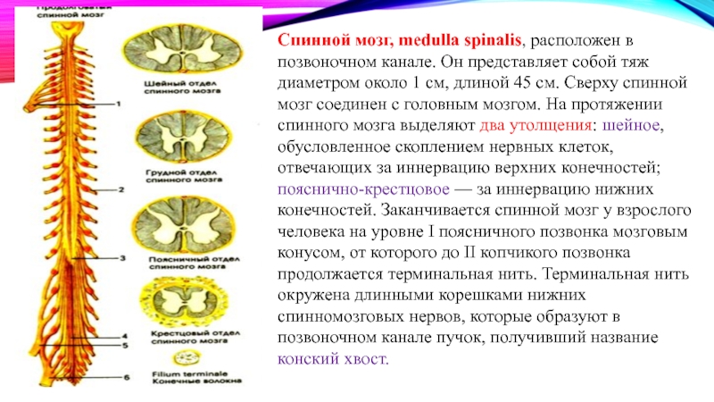 тяж диаметром около 1 см, длиной 45 см. Сверху спинной мозг соединен с головным мозгом. На протяжении спинного мозга выделяют два утолщения: шейное, обусловленное скоплением нервных клеток, отвечающих за иннервацию верхних конечностей; пояснично-крестцовое — за иннервацию нижних конечностей. Заканчивается спинной мозг у взрослого человека на уровне I поясничного позвонка мозговым конусом, от которого до II копчикого позвонка продолжается терминальная нить. Терминальная нить окружена длинными корешками нижних спинномозговых нервов, которые образуют в