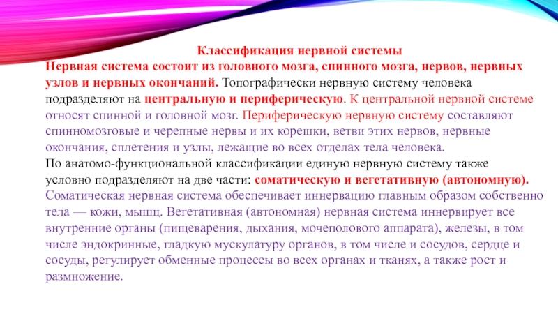 условно подразделяют на две части: соматическую и вегетативную (автономную). Соматическая нервная система обеспечивает иннервацию главным образом собственно тела — кожи, мышц. Вегетативная (автономная) нервная система иннервирует все внутренние органы (пищеварения, дыхания, мочеполового аппарата), железы, в том числе эндокринные, гладкую мускулатуру органов, в том числе и сосудов, сердце и сосуды, регулирует обменные процессы во всех органах и тканях, а также рост и размножение.