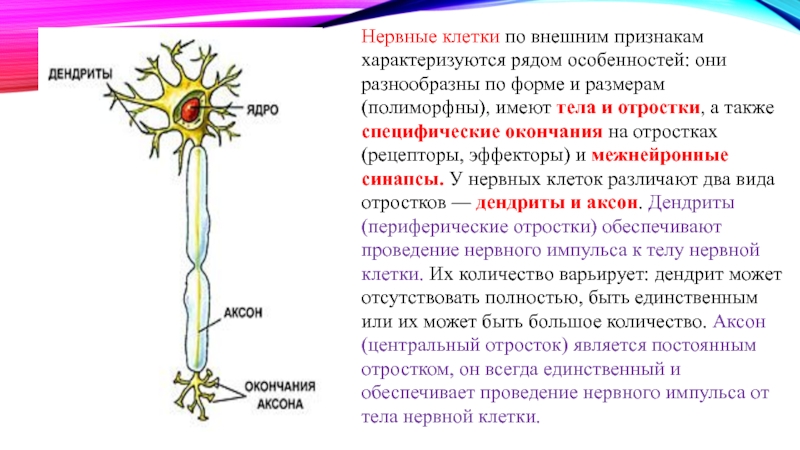 форме и размерам (полиморфны), имеют тела и отростки, а также специфические окончания на отростках (рецепторы, эффекторы) и межнейронные синапсы. У нервных клеток различают два вида отростков — дендриты и аксон. Дендриты (периферические отростки) обеспечивают проведение нервного импульса к телу нервной клетки. Их количество варьирует: дендрит может отсутствовать полностью, быть единственным или их может быть большое количество. Аксон (центральный отросток) является постоянным отростком, он всегда единственный и обеспечивает проведение нервного импульса от тела нервной клетки.