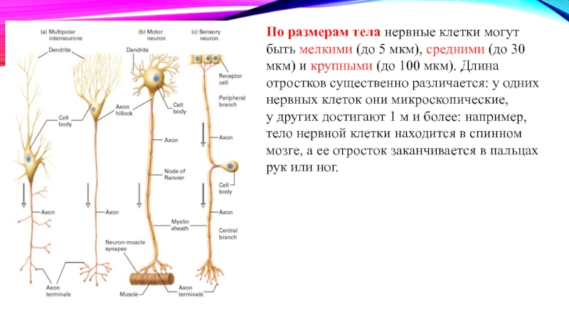 Слайд 5По размерам тела нервные клетки могут быть мелкими (до 5 мкм),