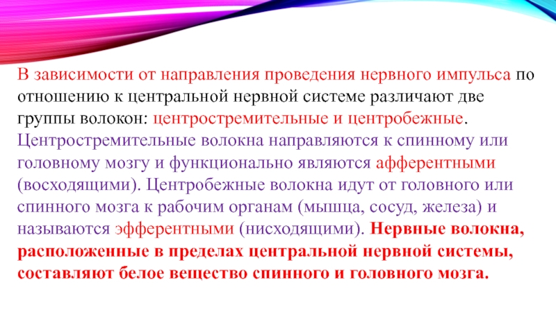 нервной системе различают две группы волокон: центростремительные и центробежные. Центростремительные волокна направляются к спинному или головному мозгу и функционально являются афферентными (восходящими). Центробежные волокна идут от головного или спинного мозга к рабочим органам (мышца, сосуд, железа) и называются эфферентными (нисходящими). Нервные волокна, расположенные в пределах центральной нервной системы, составляют белое вещество спинного и головного мозга.